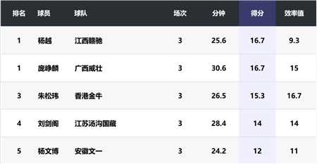 与庞峥麟场均得分并列本土得分榜第一位的杨越(江西赣驰),场均拿下16.7分,三分球命中率高达41.7%;得分榜第三位的朱松玮(香港金牛),场均拿下15.3分,投篮命中率和三分球命中率分别高达65.4%和62.5%;而以场均12分排在本土得分榜第五位的杨文博(安徽文一),也曾在四川刚刚升入cba时,短暂效力过这支球队。