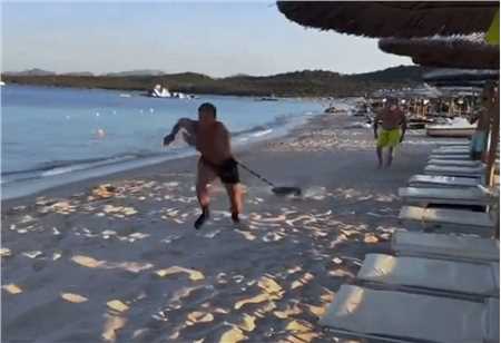 不过弗拉泰西即便在沙滩上度假,还是坚持训练。没有基地的降落伞可用,就自己玩负重跑。
