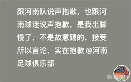 孙伟哲写道:“跟河南队说声抱歉,也跟河南球迷说声抱歉。是我出脚慢了,不是故意踢的。接受所有言论,实在抱歉 @河南足球俱乐部 。”