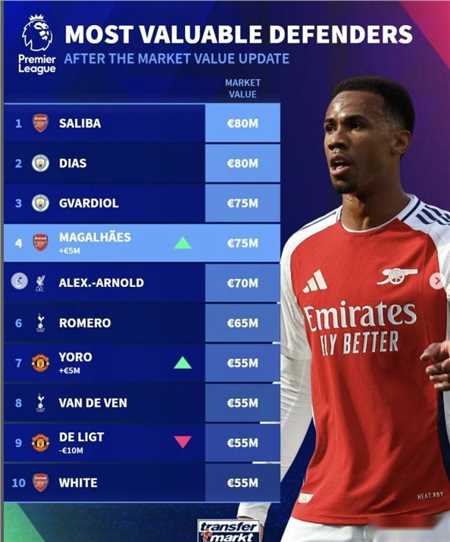 北京时间10月3日晚,德国转会市场更新了英超球员身价,并盘点了英超后卫身价榜,其中萨利巴、鲁本-迪亚斯均为8000万欧。