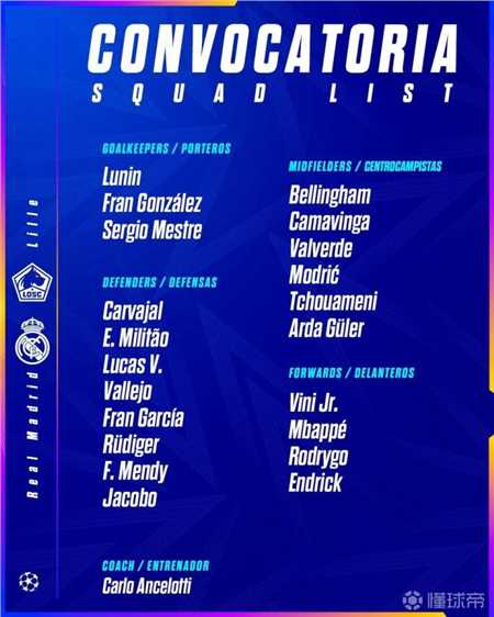 皇家马德里官方公布了欧冠联赛阶段第2轮客场对阵里尔的比赛大名单,维尼修斯领衔,此前受伤的姆巴佩在列,库尔图瓦伤缺,比赛将于北京时间10月3日凌晨3:00进行。