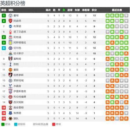 第一支是领头羊曼城!4胜1平积13分保持不败。本轮英超,曼城主场2-2艰难绝平10人阿森纳。罗德里伤退,德布劳内伤缺,加上已经卖了阿尔瓦雷斯,曼城本赛季卫冕难度极大。