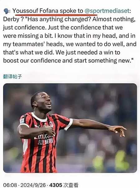 信心!米兰现在变得越来越有信心!福法纳说德比之战的胜利为我们带来了信心,之前大家都想做好自己的工作,但是有点缺乏信心,在我与我队友的心里,我们都想做好,我们也做到了。我们只是需要一场胜利来增强我们的信心并开始新的东西。福法纳与埃摩森貌似还就是符合这个信心说,本来在之前的球队能力是不弱的,但是到了米兰后感觉有些畏首畏尾,期望福法纳可以如自己所说的,拥有信心后可以越来越好。