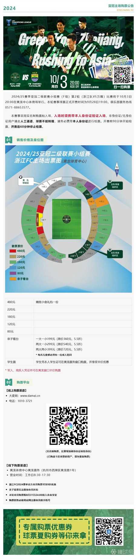 浙江队官方消息,亚冠二级联赛主场对阵印度尼西亚球队万隆队的门票将于9月28日19:00开售。