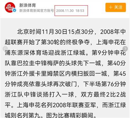 2008年,上海申花主场迎战浙江队,在第76分钟浙江的谈扬打进一个进球,这样被逼平上海申花,61分排在联赛第二名,山东泰山是第一名63分 ,如果不丢这2分的话,申花或许是冠军,那个赛季上海申花赢了17场,平了10场,输了3场,进球58个,丢球29个