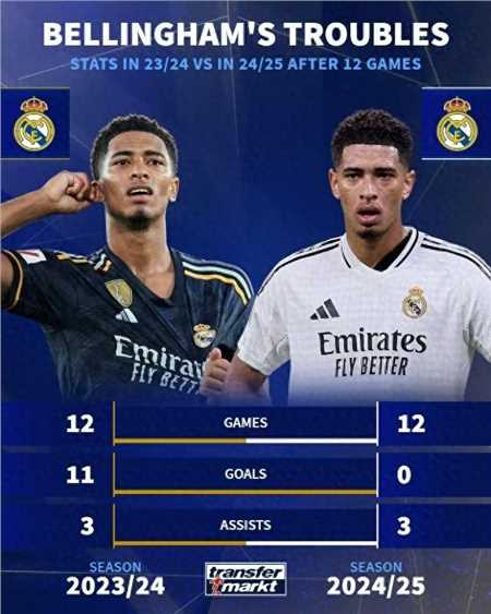 贝林厄姆上赛季进球如麻,本赛季至今各项赛事仍没有取得进球。对此,德转制作了一张贝林厄姆上赛季前12场以及本赛季的同期参与进球数据对比图。并如此配文:belligoal vs bellinow。