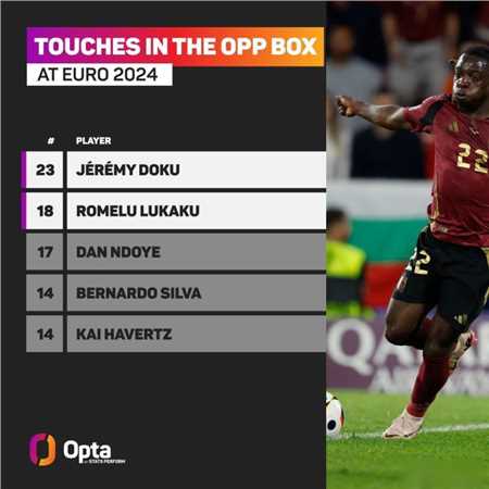 据统计,前两轮小组赛中在对方禁区内触球次数最多的前两名球员全部来自于比利时,他们分别是多库和卢卡库。