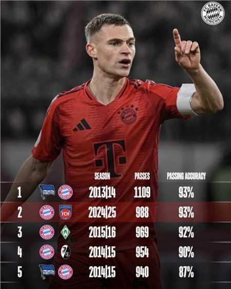 2、拜仁vs海登海姆 2024/25赛季 传球988次 传球成功率93%