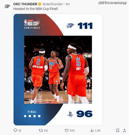 北京时间12月15日,nba杯西部决赛,雷霆以111-96击败火箭拿下五连胜。此役雷霆是逆转取胜,sga上半场表现不佳,可下半场挺身而出帮助球队完成逆转,末节登场后一波流带走比赛。雷霆进入杯赛决赛保底20万美元。