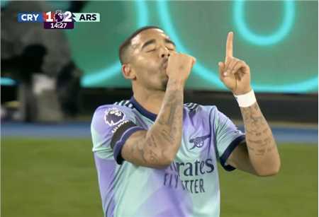 此役客场对阵水晶宫,热苏斯在比赛第6分钟和第14分钟各入一球。