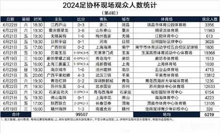 足协杯第4轮的比赛全部结束,观众人数方面云南玉昆主场19368人居首,重庆铜梁龙、广西平果哈嘹、苏州东吴、陕西联合主场观众人数均过万,本轮平均观众人数为6219人。